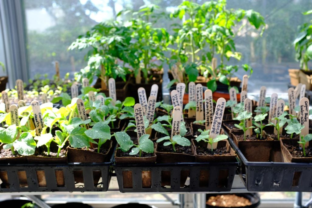 (Image description: trays of various young seedlings with plant tags sit in a sunny window.)