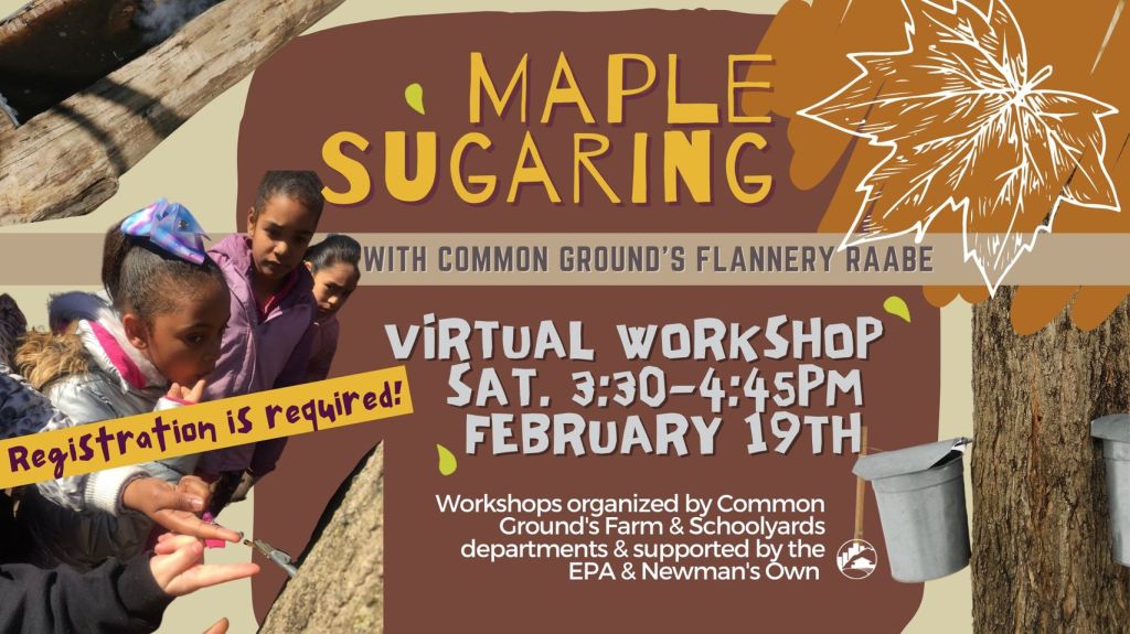(Image description: a flyer inviting people to sign up for the Maple Sugaring Virtual Workshop on Saturday, February 19, from 3:30-4:45 pm. A banner indicates that registration is required, and that the workshop will be lead by Common Ground’s Flannery Raabe)
