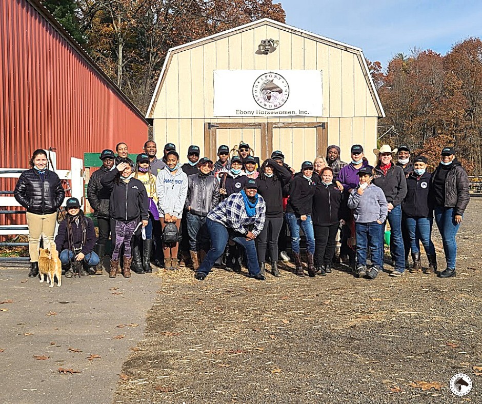 (Image description: a group of several people gather in front of a tan barn-shaped shed, featuring the Ebony Horsewomen logo as a banner over the door. The people are smiling at the camera. Some pose to allow others behind them to be seen. A yellow dog sits at the feet of the person standing farthest to the left of the image.)