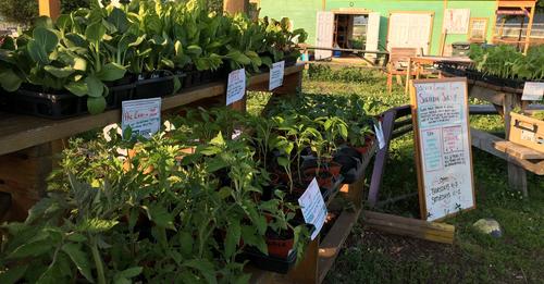 (Image description: wooden shelves hold a full display of seedlings, labeled with white tags. In the foreground, a whiteboard shows illegible text. In the background, empty picnic tables and the shed with an open door rest in the sunshine.)