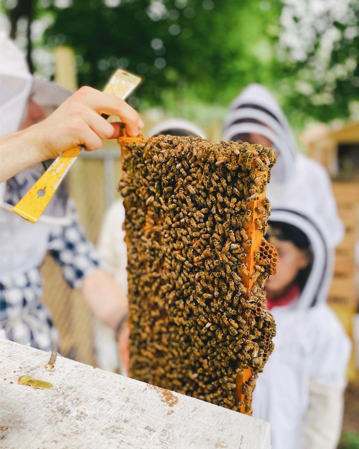 (Image description: a pair of white hands holds a frame full of honey comb aloft. The comb is covered with bees. Behind the frame, there are individuals in bee-keepers’ outfits watching at a respectful distance.)