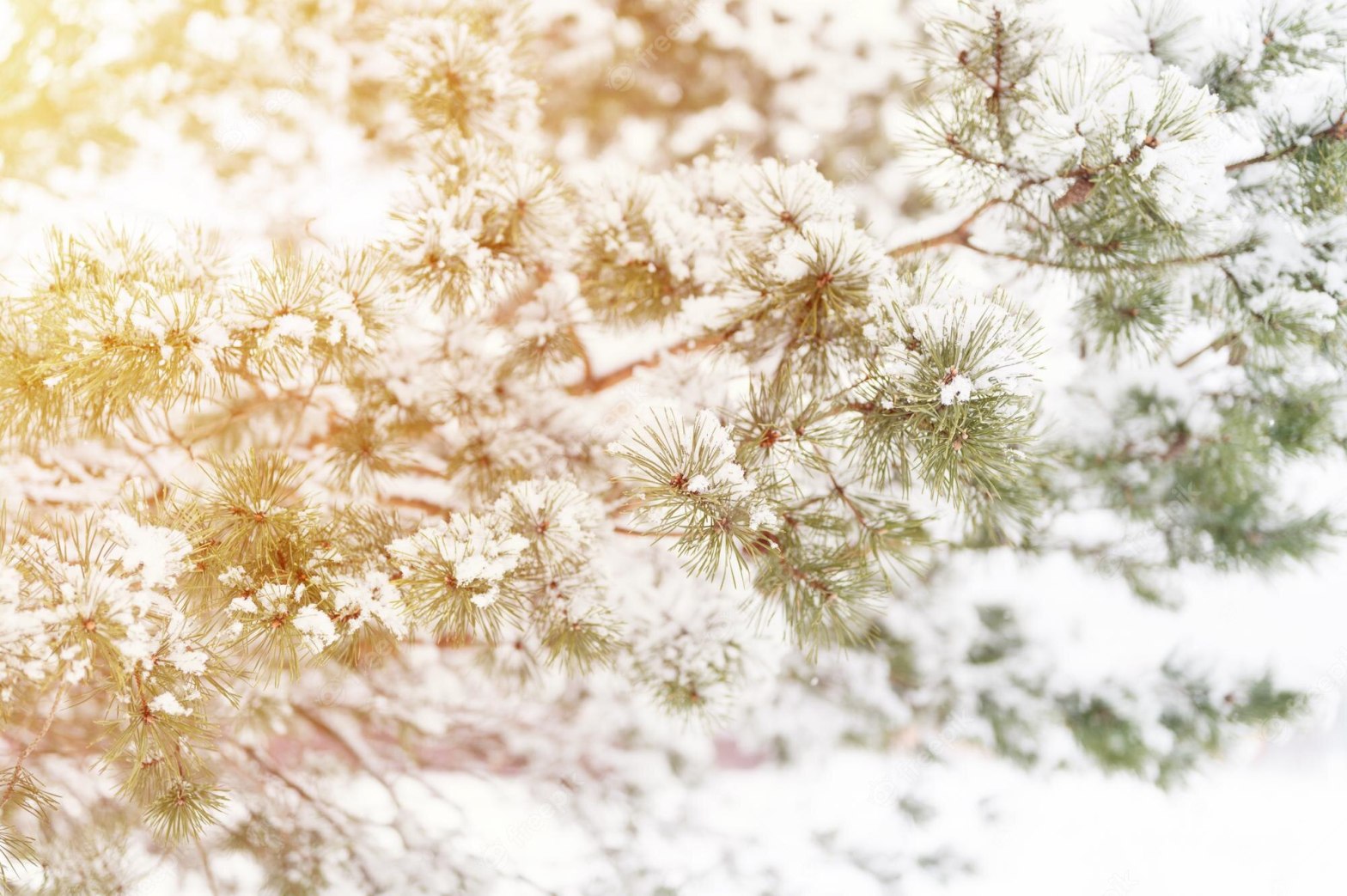 Image description: an over-exposed image of a frozen evergreen bough before a snowy background. The left side of the image is bleached yellow from the overexposure. /end description